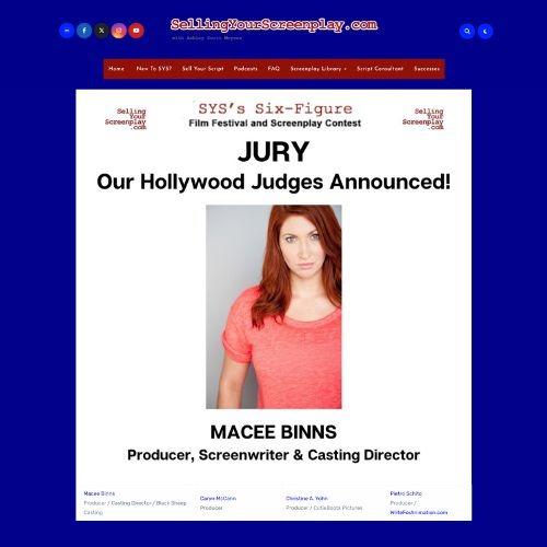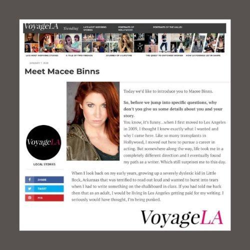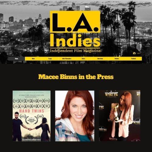 Macee Binns has received press recognition for her work as a screenwriter, casting director, and actress, in addition to launching the B!tchFest Film Festival & Screenplay Contest. She has been featured in publications such as LA Indies Independent Film Magazine, VoyageLA, Canvas Rebel, and Bold Journey Magazine.